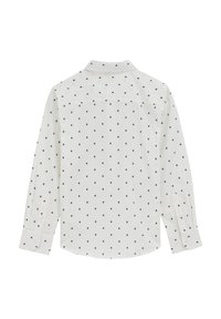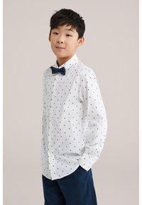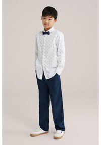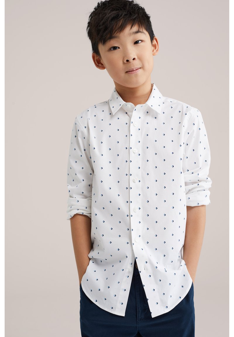 Berniukas trumpais tamsiais plaukais, vilkintis baltą marškinius su mažais mėlynais rombo formos raštais ir tamsiai mėlynas kelnes, stovintis rankomis kišenėse.
