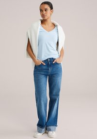 Šviesiai mėlynas V formos kaklo marškinėlis iš minkštos medžiagos, derinamas su baltu mezginiu, kuris apsukamas aplink juosmenį, dėvimas su tamsiai mėlynomis džinsais.