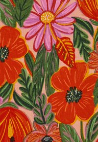 Jauna mergaitė šypsosi, dėvi baltą didelio dydžio marškinius su spalvingu gėlių ir širdelių raštu bei ryškias gėlių pieštuko tipo kelnes.